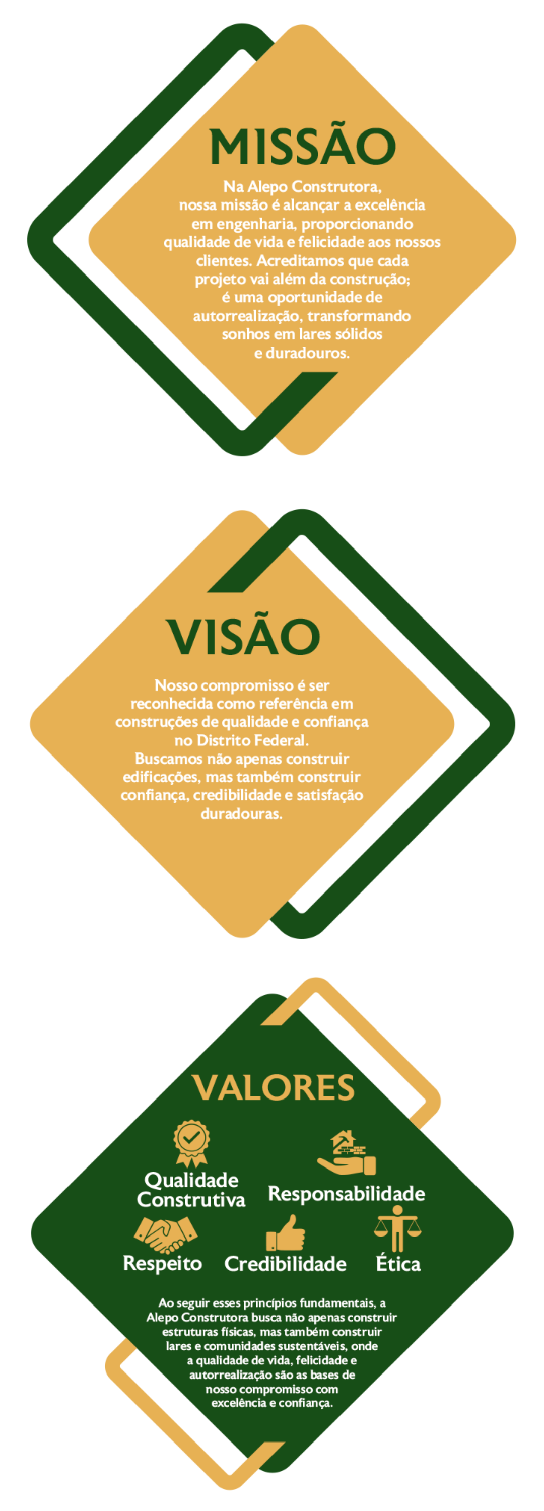Nossa missão é alcançar a excelência em engenharia, proporcionando qualidade de vida e felicidade aos nossos clientes. Buscamos ser reconhecidos como referência em construções de qualidade e confiança no Distrito Federal, mantendo padrões elevados de qualidade, responsabilidade, credibilidade, respeito e ética em todas as nossas interações.